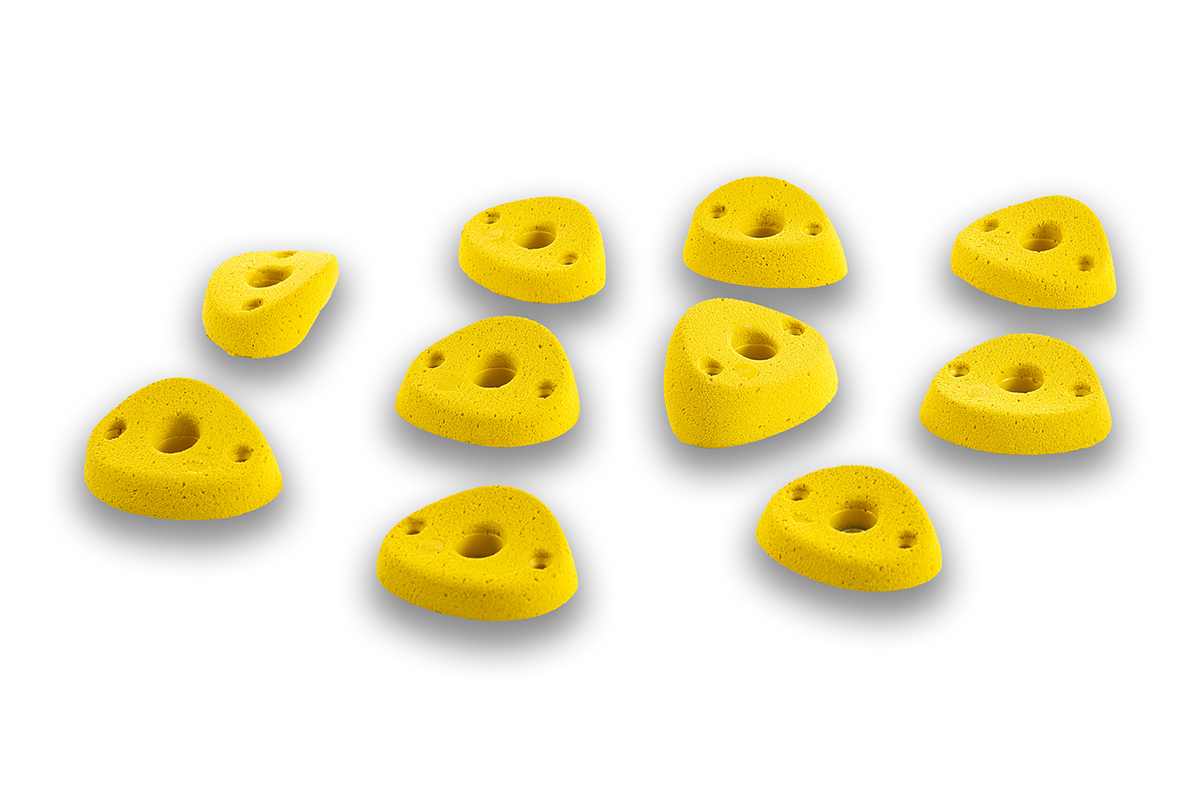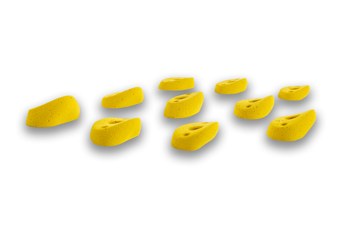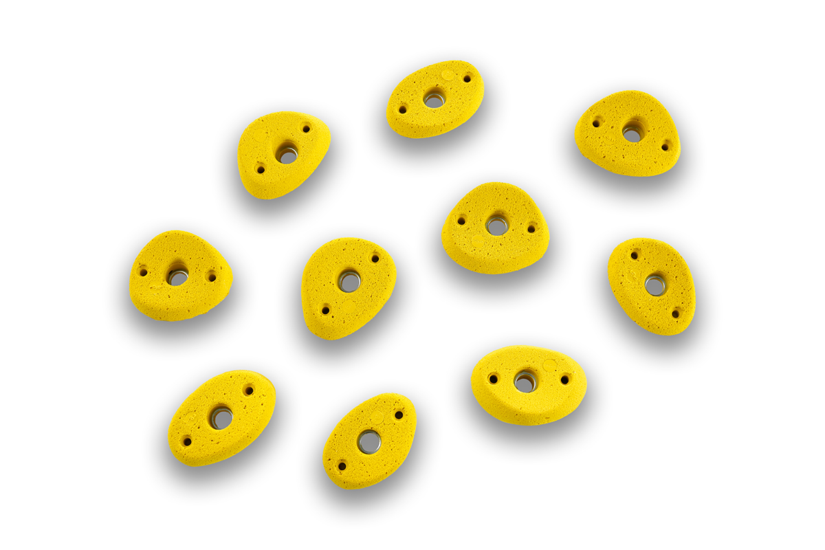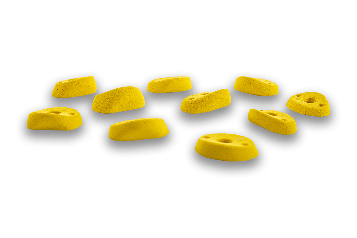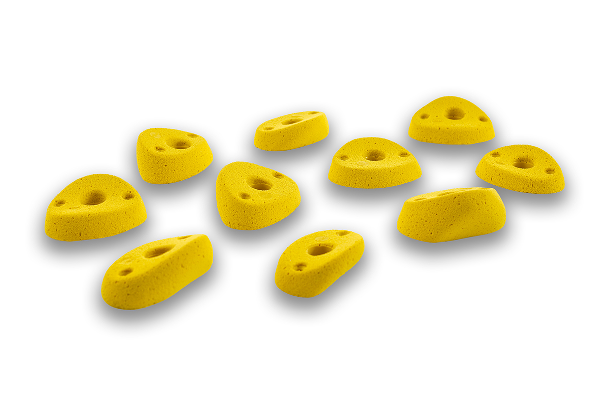 Set of 10 positive M sized footholds, from slightly to highly incut, perfects on overhanging terrain or as finger jugs on flat walls and slabs.